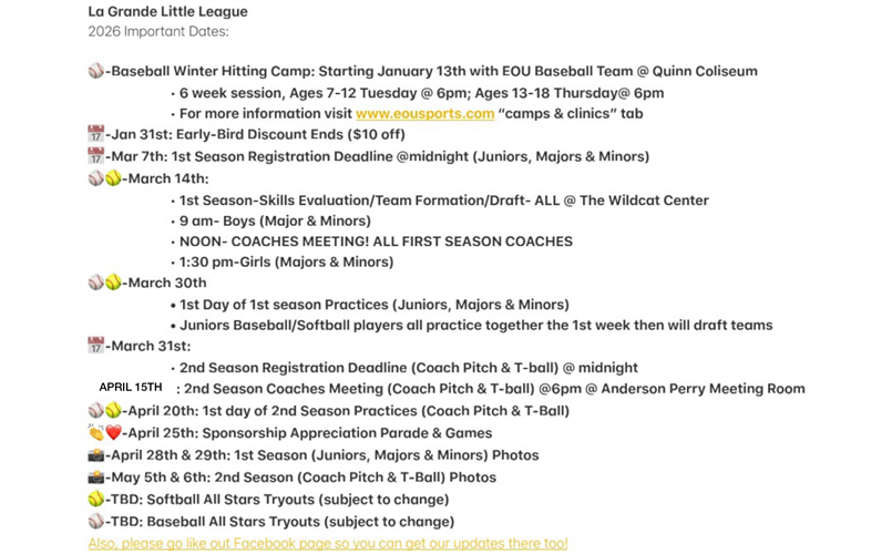 The La Grande Little League (LGLL) Board and Regular Members will meet at 6pm at 409 N Fir St., La Grande, OR 97850 - the updated LGLL Constitution will be among the agenda items.